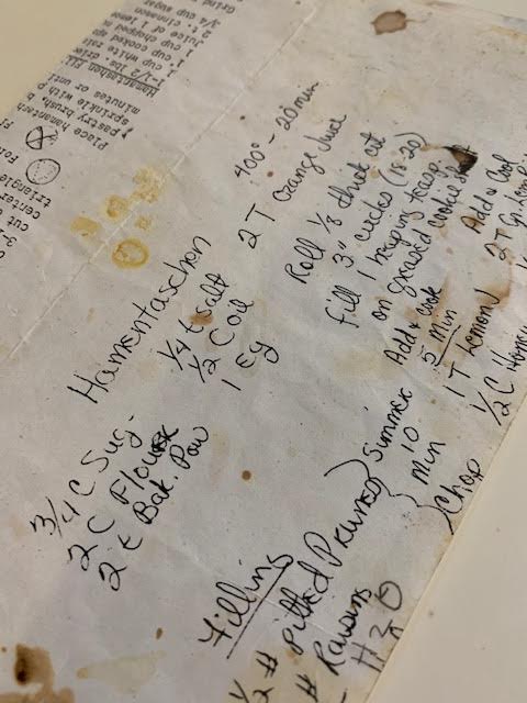 So many things to celebrate … the preservation of the Jews, friendship, love, memories … as with writing, there is a spiritual element to food. And to sharing. Those photos are awesome and I find the stained recipe itself so moving. And – I actually like prunes! Always did. Beautiful job preserving so many elements of your life in this one slice.