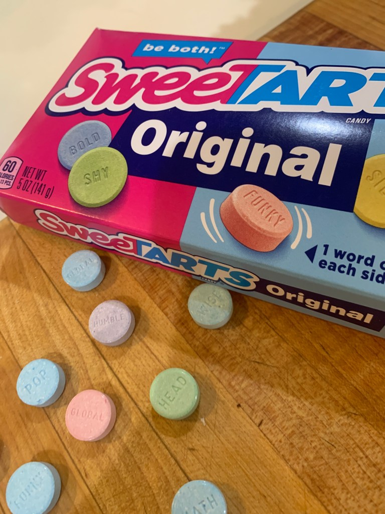 I’d have to dig in to the candy and find out. But here’s the thing. I couldn’t just open a box of candy and waste it. And to tell the truth, I can maybe tolerate a few SweeTARTS before my teeth begin to hurt. Thankfully, my 20-year-old was on the task. He helped me sort through and find all the different word pairs on the SweeTARTS as I listed them. He also helped me eat said SweeTARTS. Talk about taking one for the team!