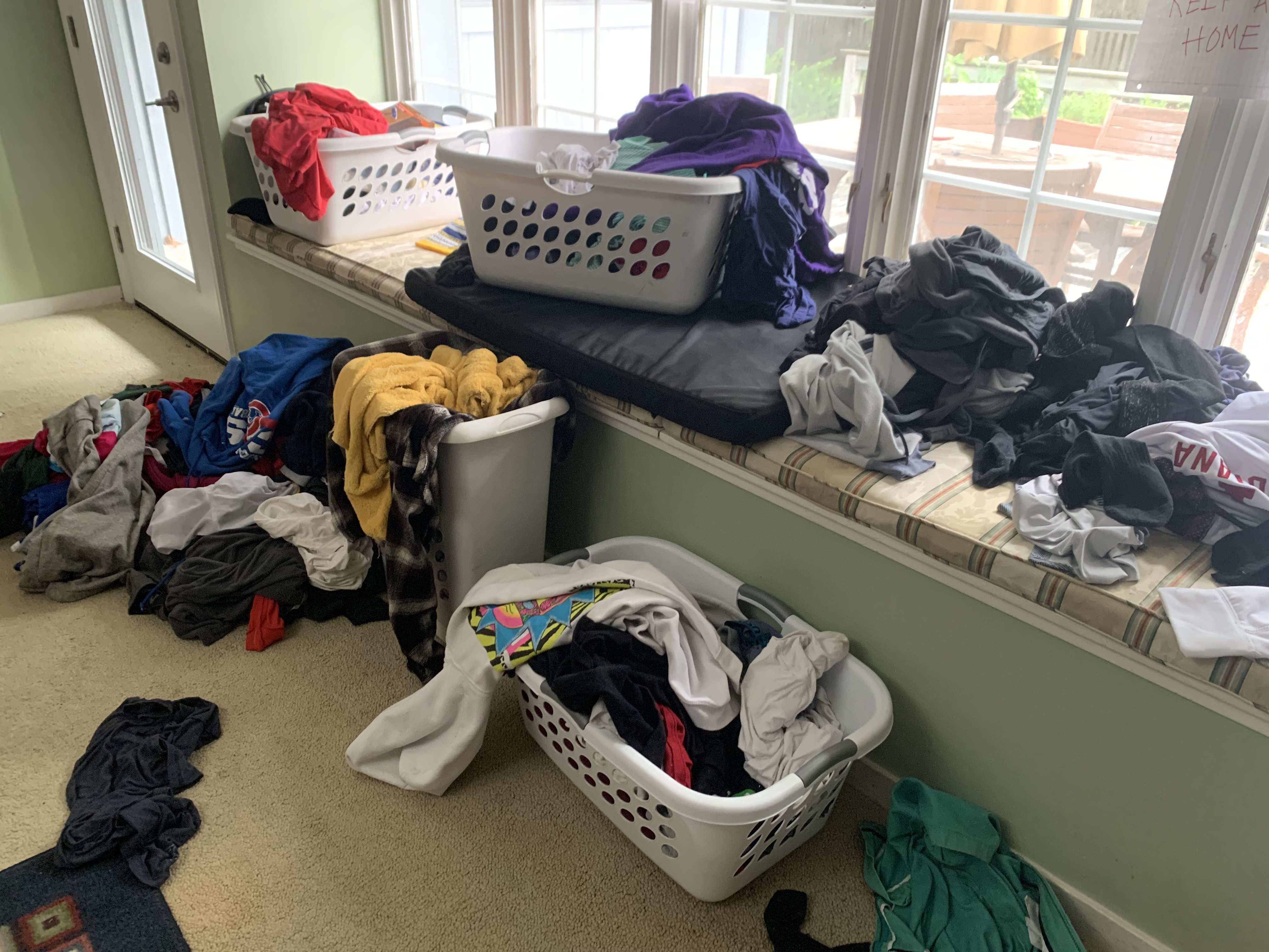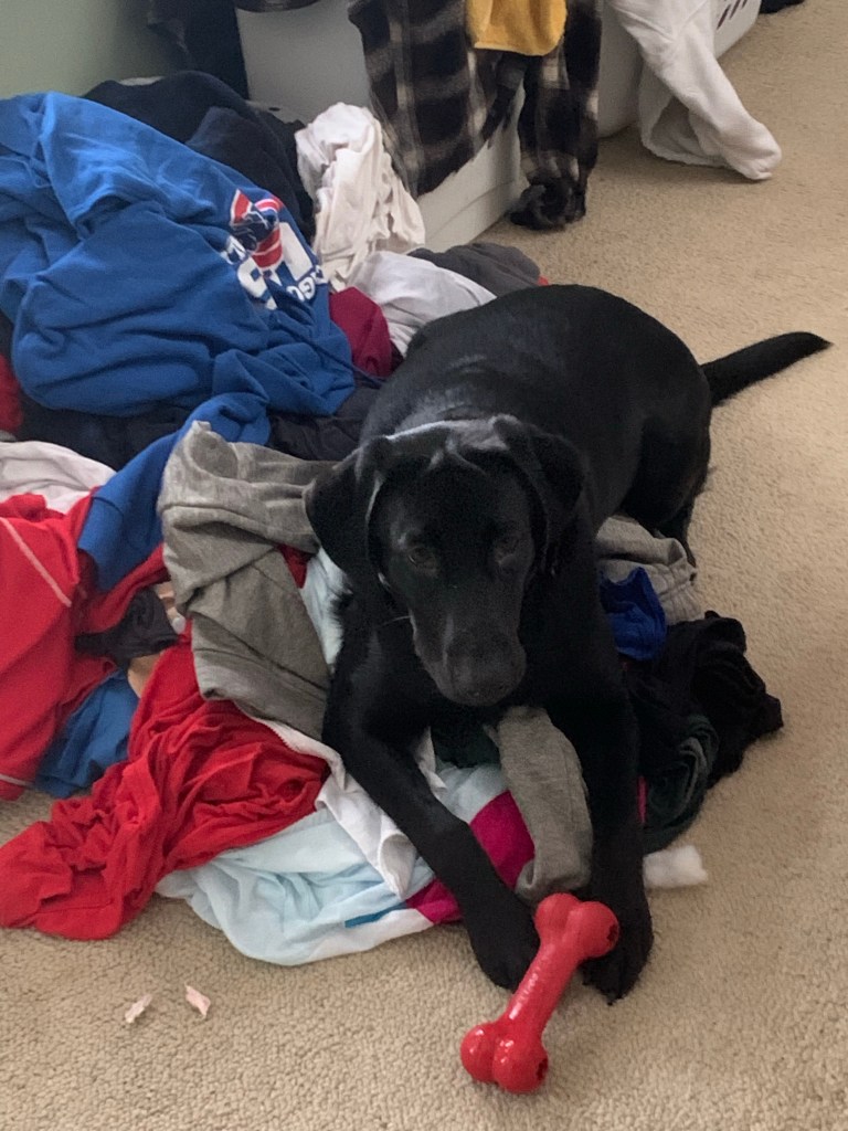 That little mama dream I had of piles of clothing, sorted out by what goes, what stays? C’mon. Who am I fooling? That’s not going to happen. And that’s okay. It may boil down to my son scrambling for a half hour with a bunch of garbage bags, but as long as the clothes are gone from the living room by the time my son is, I will be just fine.