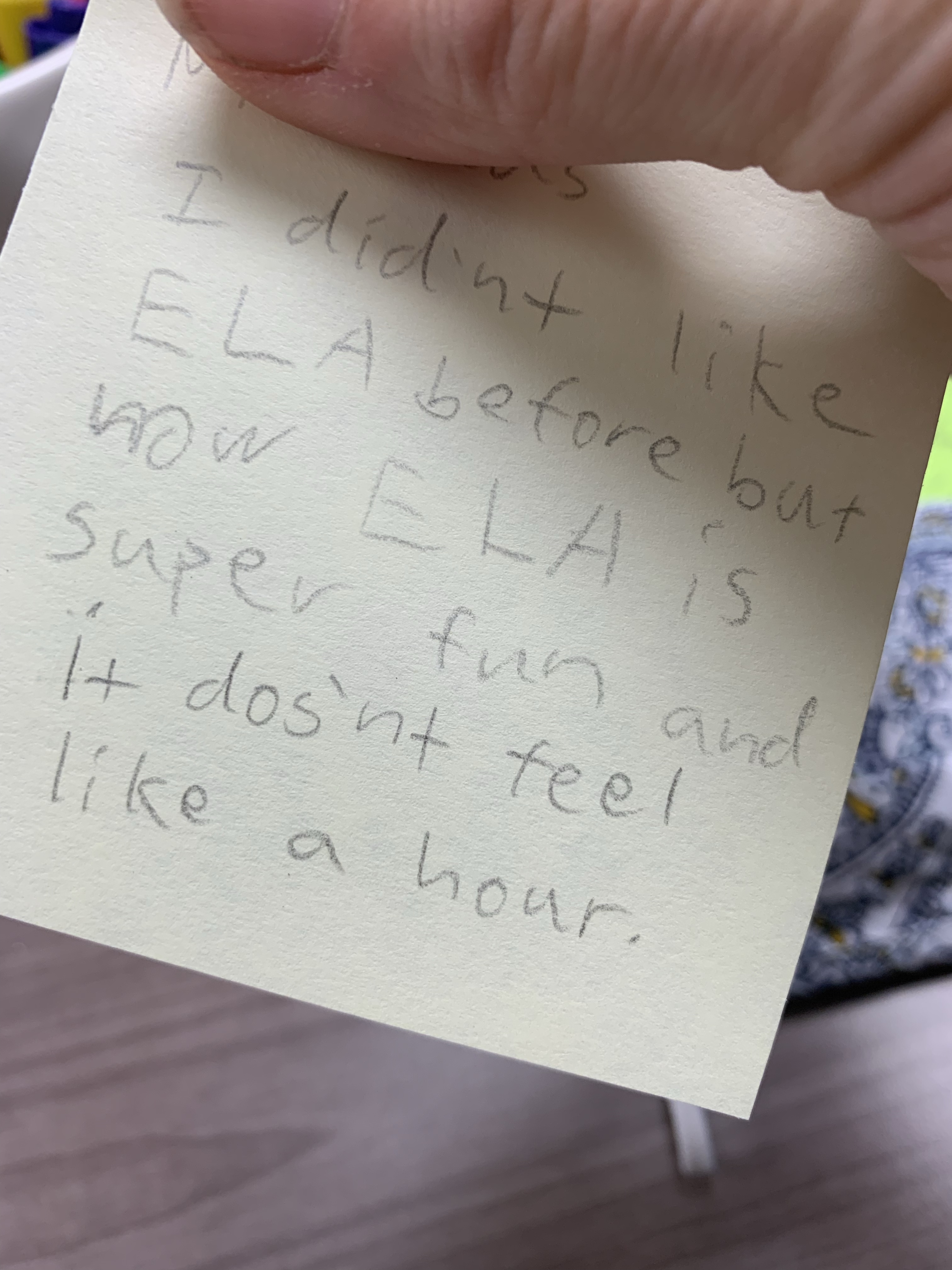 2. I adore sticky notes! I cannot function without them at school AND home. I keep various sizes, multiple colors, lined and unlined…I once saw a teacher conferring with students, jotting anecdotal notes on a sticky; she later transferred them to tabbed binder pages labeled with student names. The sticky-note possibilities are endless! That one about ELA being super fun… I’m thinking mat, frame…