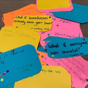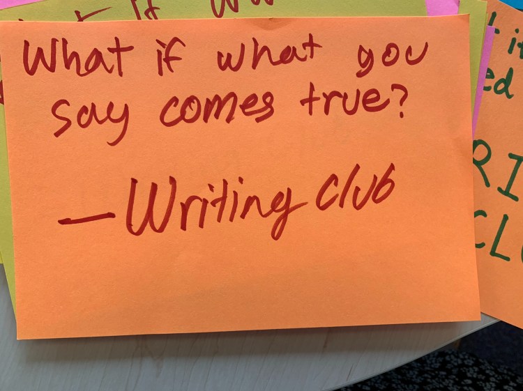 So this week, our writing club played with the idea. What if? What if? What if? The kids came up with fantastic, insightful ideas. And throughout the next week, we’ll be posting them all around our schools for other kids to ponder about, to roll with, and – who knows? – maybe to write about.