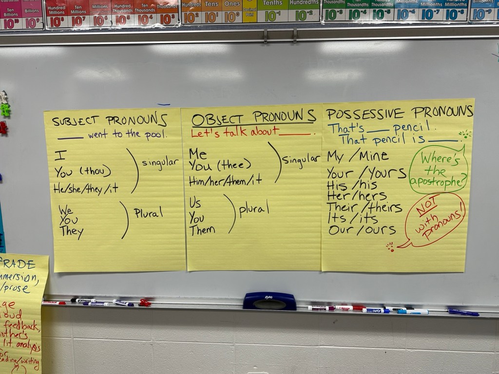 And in what can best be described as a sneaky move on my part, I taught a lesson on pronouns before we began so that kids could understand the difference between “thee” and “thou.” Don’t tell them, but I also used the lesson to teach a trick for why first, second, and third person narration are named as they are. Oh, the sacrifices I make…