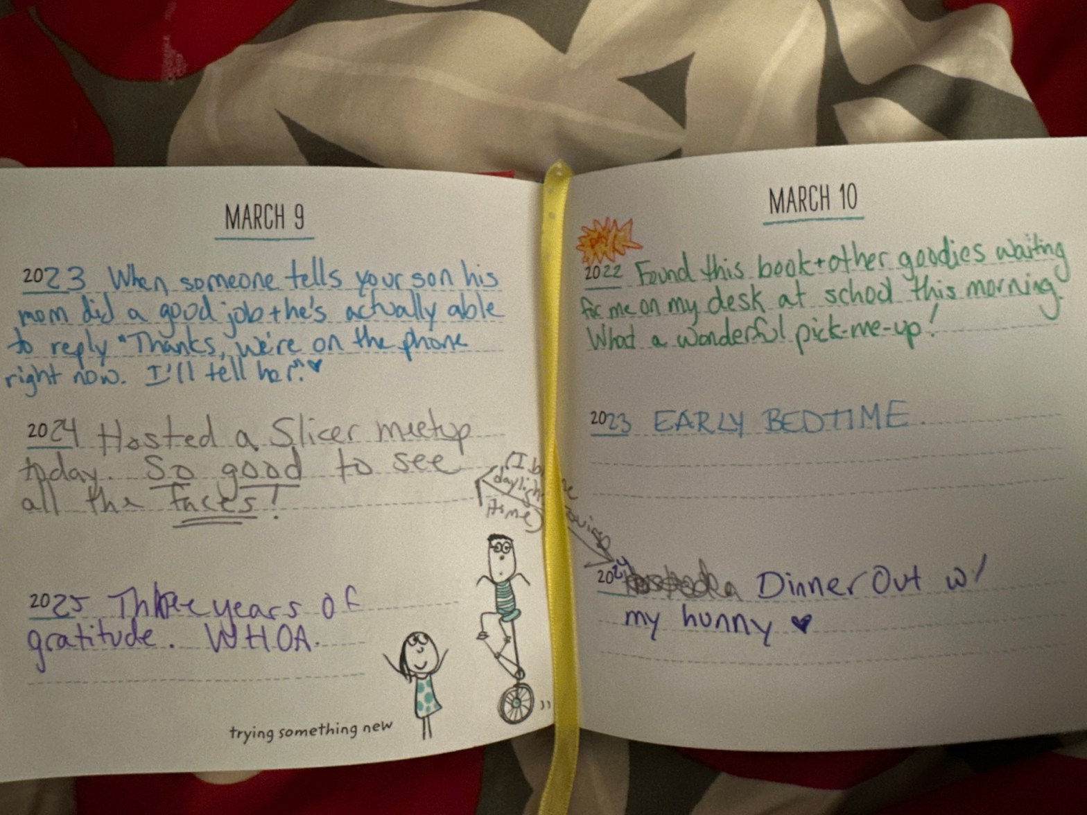 Over the years, it’s been fun to just record one little snippet of what had been great or wonderful about the day. And in this last year of the journal, I’ve enjoyed looking back over time. (Psst…did you see March 9 from last year?)