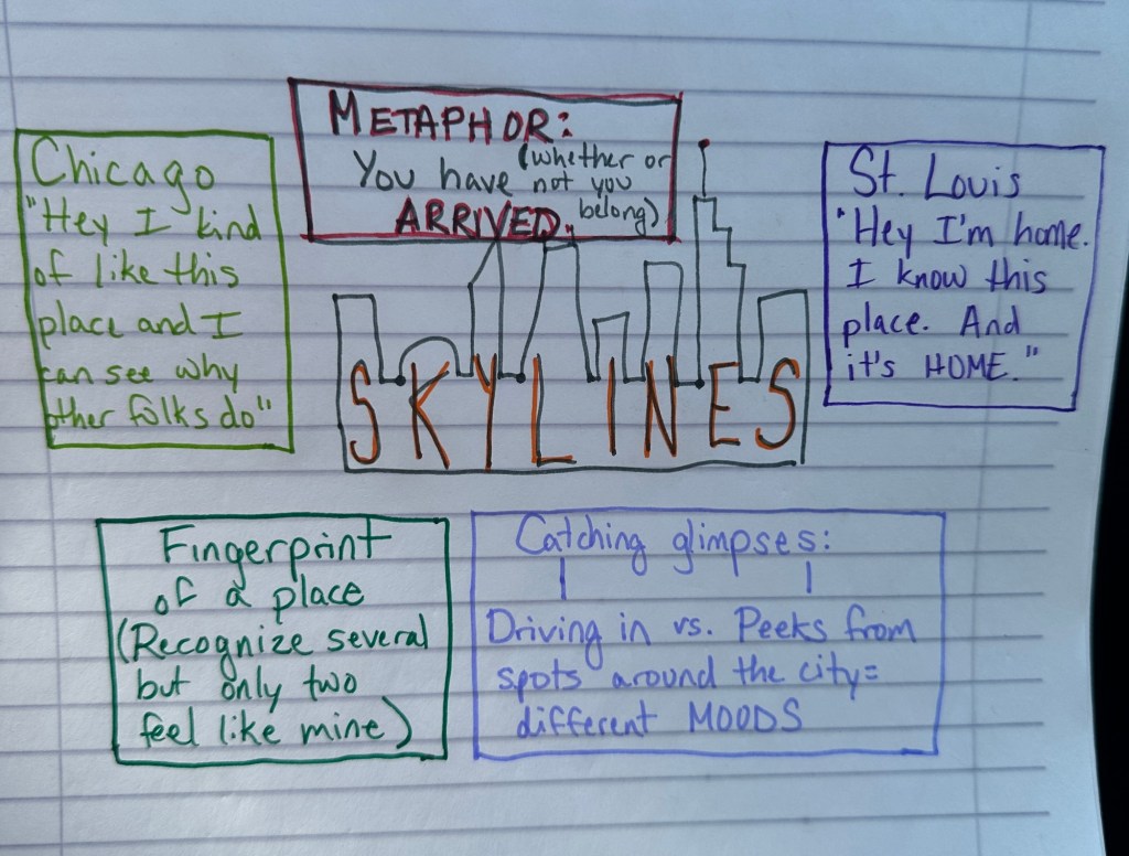 Just after 7:00 we rounded the bend to see the skyline of the city, which got this ole brain musing. Thought I’d diagram my thoughts today, since they refuse to walk through the hallways in an orderly fashion. Enjoy my musings, and feel free to share your own ideas about skylines as well.