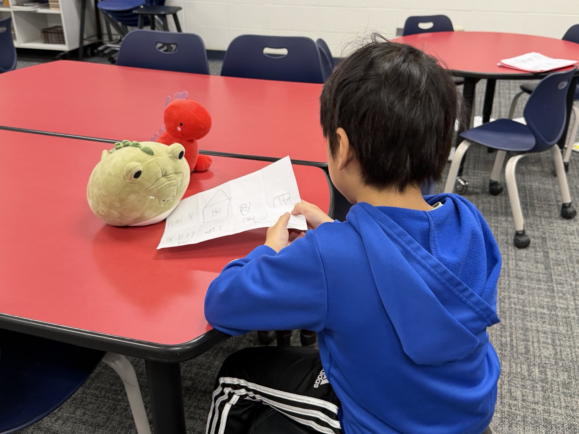 Whirlwind that arrives eventually in an exhale and a deep satisfying breath. Seeing students telling their stories to stuffed figures is calming to me just as an observer. Given your action-packed pajama morning, the relief of meeting a group of students ready and willing to dive into the day is palpable.