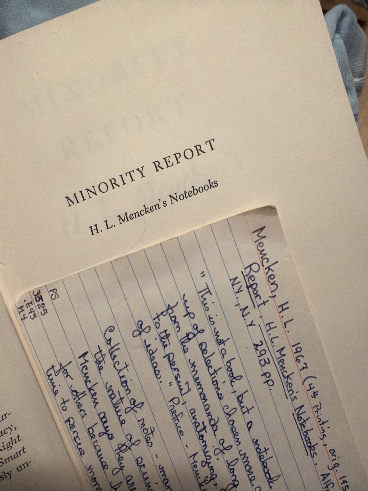 Next Up. Minority Report by H.L. Mencken. I’ve always wanted to read this book, and my father-in-law happened to have this first publication copy. Still, that’s not the most amazing thing about it. You see, my father-in-law is in the beginning stages of dementia. But before that, he spent a life as an relentless learner. When he read, he would take copious notes. So I don’t just have the book itself, I have all of his notes, numbered and cataloged, as a window into his way of thinking. I can’t wait to spend time there.